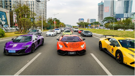 壮观的超跑车队在东莞大道上巡游,夺目的色彩和雄浑的声浪让人内心澎湃。