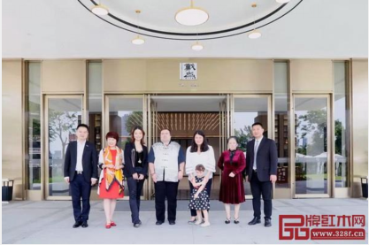 保加利亚共和国驻华大使馆一等秘书、领事丹妮叶拉(右三),保加利亚工商联合会粤港澳地区负责人杰富(左四),美国北加州深圳联谊会会长李颖(左二)以及大中华华人华侨文化交流基地秘书长李小龙(左一)等与戴为红木董事总经理翁肖尤(左三)合影