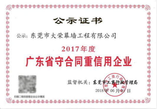 凭借着多年务实、诚信的经营,公司发展日益强盛,广东大荣幕墙资质不断升级,现已取得《建筑幕墙工程专业承包壹级》、《钢结构工程专业承包贰级》、《建筑装修装饰工程专业承包贰级》、《施工劳务不分等级》等国家认证资质。