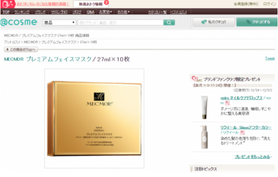 (图:@cosme网站推荐名膜壹号抗皱美肤驻颜生物面膜)
