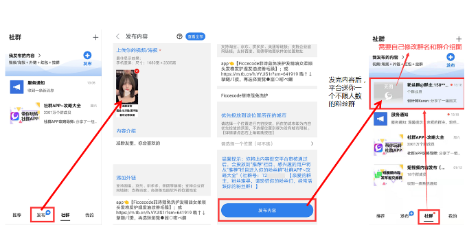 第1步,打开社群APP,你要先发布一个关于你的产品和服务的短视频或海报。凡是通过了平台审核的,平台会推荐给大量粉丝,然后把感兴趣的介绍到你的粉丝群里来。(首次发布时,APP会送你一个不限人数的粉丝群,记住,你是这个粉丝群的超级群主!)