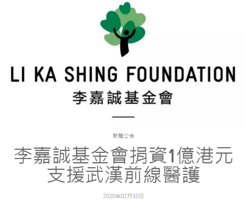 其中“李嘉诚基金会”捐款1亿港元用于武汉抗疫工作,基金会表示,面对新冠肺炎疫情,武汉前线医护为拯救病患作出无私奉献,竭力抗疫,故捐资支持武汉前线医护。原本计划把捐款连同医护物资一并发放,但筹措和组织物资运送皆具挑战性,因此决定捐款先行,物资随后补上。基金会透过“中联办赈灾”专户,捐款1亿港元,支持武汉前线医护。