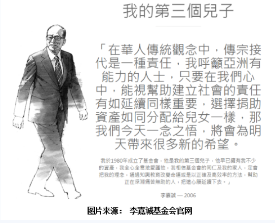 在华人商界,李嘉诚可谓是相当有名气,在做生意成功的同时,他也是一个大慈善家,几十年来向内地捐款超过200亿。分析李嘉诚基金会的捐助项目,不难发现教育、医疗是重中之重,这与他幼年的痛苦经历有关。李嘉诚早年接受央视《面对面》节目专访时坦言,衡量财富的准则,在于“内心的富贵”。他认为,真正的富贵是要懂得用自己得来的金钱,对社会尽一点义务和责任。若自己能够在这个世界上,对其他需要帮助的人有所贡献,这便是内心的财富。