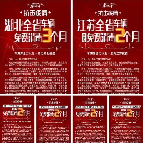 自疫情爆发后,为了支援抗疫,车海洋科技集团快速反应,在全国范围内发起了“低价洗车、免费消毒”的公益行动,号召全国一万个网点都行动起来,免费为汽车消毒,切断病毒传染链条,保障车主健康出行。从2月7日开始,陆续在湖北、上海、江苏、山东、广东、广西、湖南、福建、吉林、江西、浙江、云南等多个地区推出车辆免费消毒活动。目前,车海洋专业的免费消毒服务已经覆盖全国20多个省市,数千个网点实现了线下免费消毒。