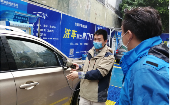(车海洋工作人员在洗车网点指导车主消毒车辆)