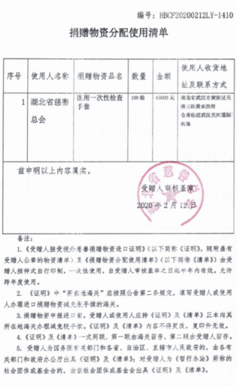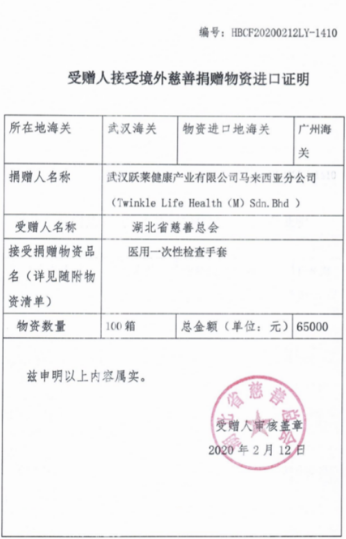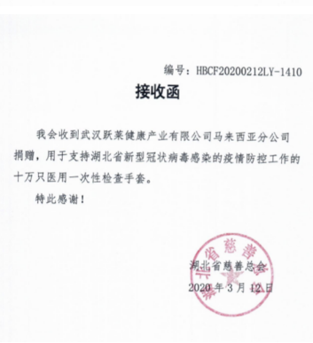 如今,新冠肺炎防控工作进入关键时期,跃莱公司勇于担当,积极承担企业社会责任,再次利用海外渠道,向湖北省慈善总会捐赠价值6.5万元、数量10万只的医用一次性检查手套,积极支援湖北抗疫一线,以实际行动助力疫情防治。