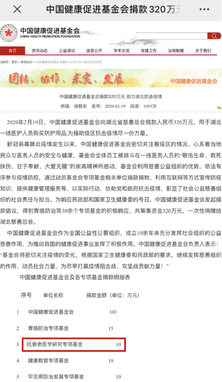 爱心捐款暖人心,齐心协力抗疫情!近日,在湖北疫情发展迅速,各类抗疫物资紧缺情况之下,武汉跃莱健康产业有限公司联合中国健康促进基金会,以抗衰老医学研究专项基金的名义,向湖北省慈善总会捐款人民币10万元,用于湖北一线医护人员购买防护用品,为援助疫区抗击疫情尽一份力量。