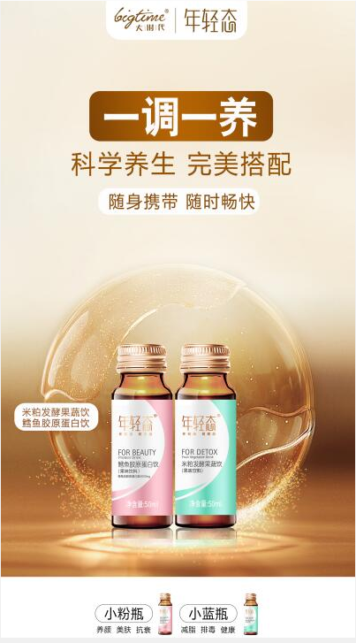 年轻态——大时代老陈品牌战略升级力作,与国民健康第一的巨人集团联合推出的健康产品系列。老陈出品必属精品,品牌一经推出就引起了行业震荡,为新一代健康饮品注入了新鲜血液。年轻态鳕鱼胶原蛋白饮(小粉瓶)和年轻态米粕发酵果蔬饮(小蓝瓶)2款产品,一调一养,科学养生,完美搭配。理念一经推出就俘获了大家的心,2款新品更是被争相抢购。