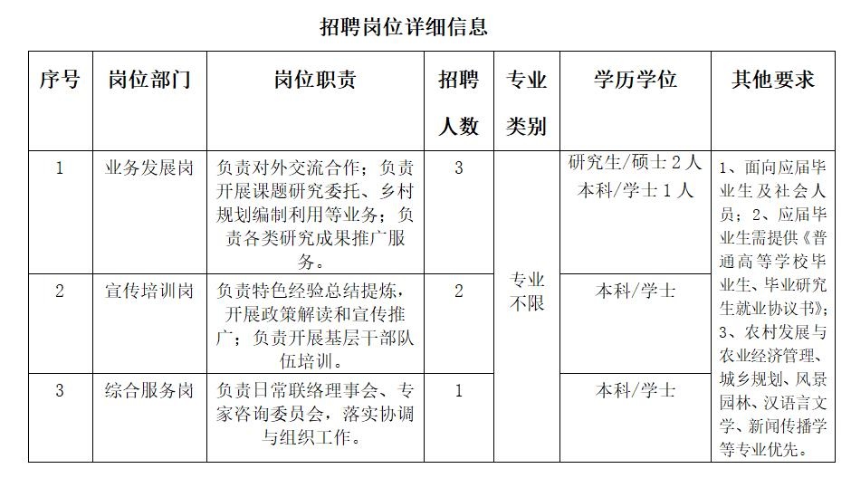 东莞市乡村振兴促进中心现因工作需要,计划面向社会公开招聘6名工作人员,办公地点设在东莞市现代农业科技园区。主要开展乡村振兴相关的研究和服务工作,具体设置为业务发展岗3人、宣传培训岗2人、综合服务岗1人。相关工作包括对外交流合作、开展课题研究委托、乡村规划编制利用、研究成果推广、特色经验总结提炼、日常公文写作等。