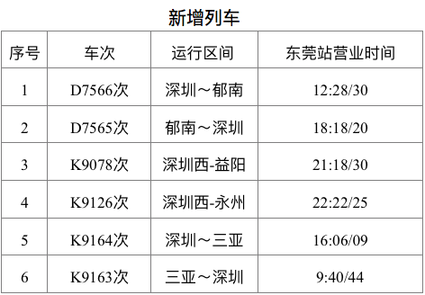 除此之外,东莞火车站还将新增4趟长途列车,分别是由深圳西开往益阳的K9078次、由深圳西开往永州的K9126次、由深圳开往三亚的K9164次、由三亚开往深圳的K9163次列车。