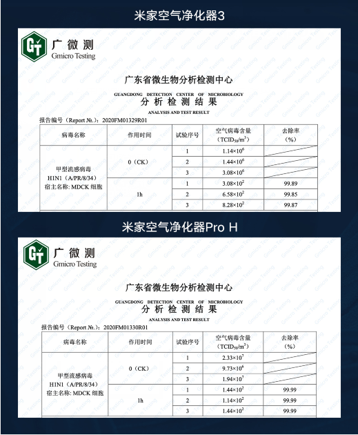 下面是广东省微生物分析检测中心提供的两款配备了高效滤网的小米空气净化器的检测报告。从其中我们看出,米家空气净化器3的H1N1病毒去除率达到了99.89%,米家空气净化器Pro H的病毒去除率达到了99.99%。