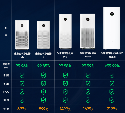 小米空气净化器采用的初效滤芯、高效滤网、活性炭三层一体式滤芯就已经能够应对常见的甲醛、TVOC、细菌等常见空气污染问题。值得一提的是,在售全系小米空气净化器的病毒去除率都超过了99%。