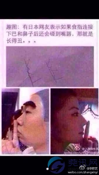 莞讯网讯:近日,有一款日本网友疯玩的测试趣图在网络上走红:如果食指连接下巴和鼻子后还会碰到嘴唇,那就是长得丑。并且有图示:左边的图是一个帅得不明显的男生,食指碰到了嘴巴,结果证明确实长得丑;右边是一位美女的示范,食指连接下巴和鼻子时,确实没碰到嘴巴,证明长得好。一时之间,演艺圈的女明星们纷纷加入到测试自己美丑的队伍中来。