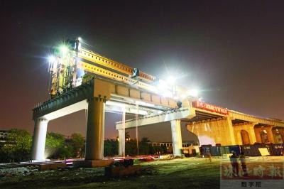 据中国铁建二十五局集团介绍,贵广、南广铁路广东段建设也在提速。昨天凌晨零时,南海三眼桥货场内依旧灯火通明,中国铁建二十五局集团投入的两台架桥机正跨越在广茂铁路上挑灯夜战,将四片重达146吨的T梁精确对位。至此,贵广南广铁路广州枢纽工程已完成架梁2610片,架梁任务完成过半。