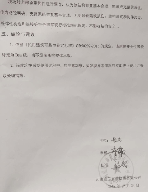 而真实情况是,凤云广场在改造之初,就已经跟原单位递交了改造装修申请报告并获同意。超市整个装修改造过程严格按照国家有关规定进行,并且有河南建工质量检测有限公司为其出具的鉴定报告:依据《民用建筑可靠性鉴定标准》GB50292_2015的规定,该建筑安全性等级评定为Bsu级,尚不显著影响整体承载。证明其装修改造并未对房屋承载造成安全隐患。