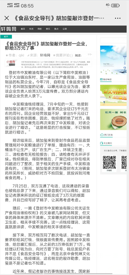 张凤云网上搜索发现:早在2018年的7月份,就有多家网站转载“《食品安全导刊》胡加玺敲诈登封市一企业,称给3万元就了事”的文章,文章所描述的登封市中发粮油有限公司被敲诈的过程,与其如今遇到的情况如出一辙。