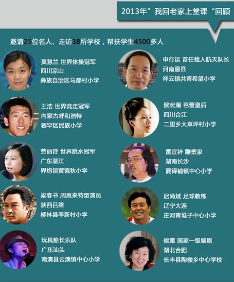 据了解,2013年参与过“我回老家上堂课”的社会人士有25位,涵盖了航空、艺术、体育、影视等多个领域。“回乡教师”共计走访了38所学校,累计帮扶学生超过4500人。除了分享专业技能,其实每一位“回乡教师”讲授更多的是个人经历,利用切身的成长过程激发孩子们的理想与信心。