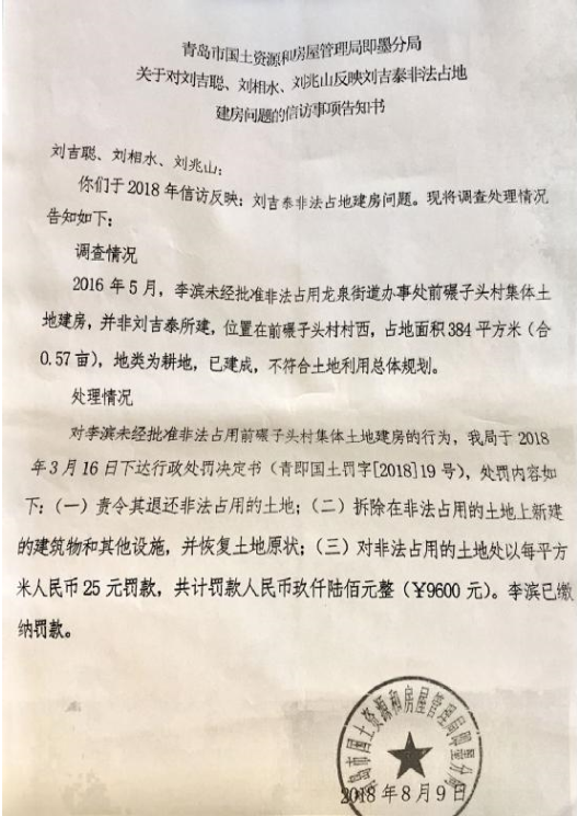 据刘相水讲,在村民的多次信访下,2018年8月9日,青岛市即墨区国土局曾下发信访告知书:对李滨未经批准非法占用后碾子头村集体土地建房的行为,我局于2018年3月16日下达行政处罚决定书(青即国土罚字[2018]19号),处罚内容如下:(一)责令其退还非法占用的土地;(二)拆除在非法占用的土地上新建的建筑物和其他设施,并恢复土地原状;(三)对非法占用的土地处以每平方米人民币25元罚款,共计罚款人民币玖仟陆佰元整(¥9600元)。李滨已缴纳罚款。
