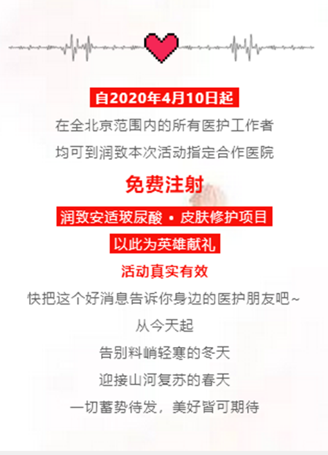 目前“润容颜,致逆行”公益活动已经如火如荼的展开,还没有领取到免费福利的白衣天使们可要抓紧时间啦,福利无限,日期有限,可不要因为自己的犹豫不决错过这次超值福利哦!抓紧时间在6月15日前到华熙生物旗下医美品牌润致指定合作机构中申请专属的美丽福利吧!暖春四月,以美相守,冲破阴霾,华熙生物旗下医美品牌润致与您一起共待最美容颜的“回归”!