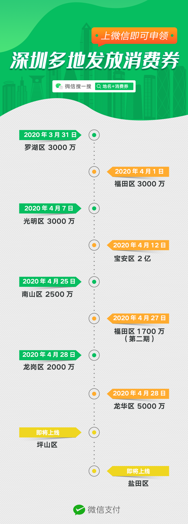 今日,深圳龙华区、龙岗区宣布联合微信发放5000万元和2000万元电子消费券,同时福田区也在昨天开启了第二期1700万元的消费券发放活动。截至今日,深圳市罗湖区、福田区、光明区、宝安区、南山区、龙华区、龙岗区均通过微信平台发放了电子消费券,总金额超4亿元。