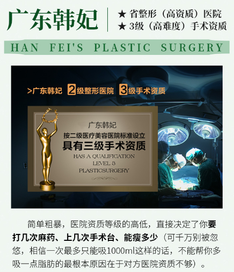 吸脂是一个对技术/设备/环境要求很高的整形美容手术,要求医院要具备相应的资质,吸脂过程才能很好的保障效果和安全!广东韩妃医疗美容医院是经过审核批准认证的省二级(高资质)专科整形医院,具备3级(高难度)手术项目资质(允许开展吸脂量高达5000ml的吸脂手术,瘦的更多更安全),并且,广东韩妃拥有15层万平独栋大楼,配备千级层流无菌净化手术室,其在医院资质、专家梯队、医疗设备以及塑美环境等都位于行业前列,硬核资质,吸脂更放心,更安全!