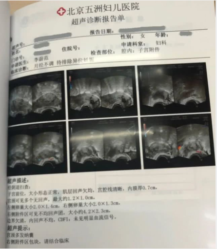 B超检查提示:子宫内膜厚0.7cm,右侧附件区可见不均回声团,约4.2*2.3cm,边界欠清晰,内回声不均。