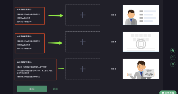 4.按要求上传个人证件正、反面照片、手持证件照片,点击「提交」,等待客服审核。