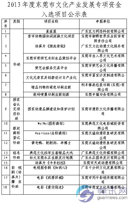 为贯彻落实《东莞市建设文化名城规划纲要(2011—2020年)》和《东莞市建设全国现代文化产业名城实施意见(2011—2020年)》,推动全市文化产业发展,根据《东莞市文化产业发展专项资金管理暂行办法》(东府办[2012]157号)的相关规定,我市开展了2013年度文化产业发展专项资金申报工作,共收到申报项目36个。市名城办对全市报送的36个项目进行了合规性审查,并组织专家评审组进行了评审,经评委会终审评出18个入选项目。其中重点文化产业补助类项目8个,获国家、省相关部门认定的配套补助类项目1个,版权商标登记补助类项目3个,贴息补助类项目2个,已播出的影视剧(动画片)补助类项目4个。