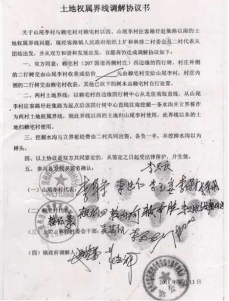 2011年,在当地镇政府的调解下,两村达成协议,划清两村土地界线:以赖宅村西边缘四行树中心从北往南取直线;从山尾李村往客路圩赶集路为起点沿该四行树中心直线往南挖掘一条水沟并立界桩作为两村土地权属界线,则此界线以西的土地归山尾李村使用,此界线以东的土地归赖宅村使用。