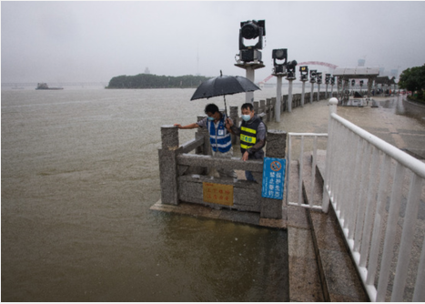 7月6日,工作人员在武汉龙王庙观察水情。记者6日从武汉市防汛抗旱指挥部办公室获悉,5日以来,武汉遭暴雨袭击,全市多处路段渍水。至6日4时,长江汉口站超设防水位1.79米,汉江新沟站超警戒水位0.01米。鉴于当前水雨汛情和渍涝情况,武汉市从6日5时起,将排涝应急响应级别提升至Ⅱ级;从6时30分起,将防汛应急响应级别提升至Ⅱ级。(来源: 经济参考报)