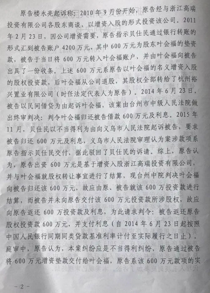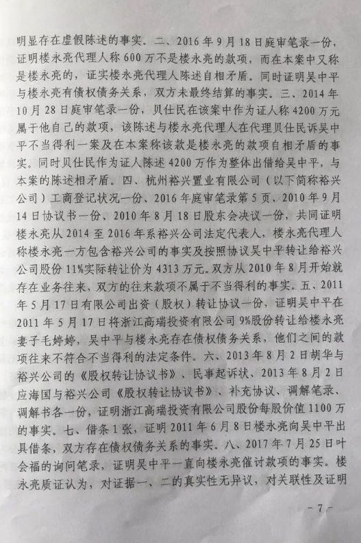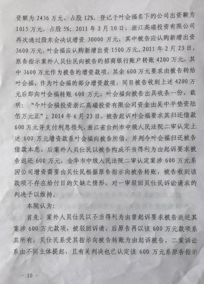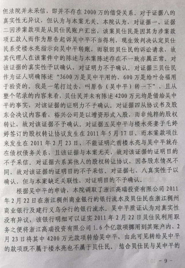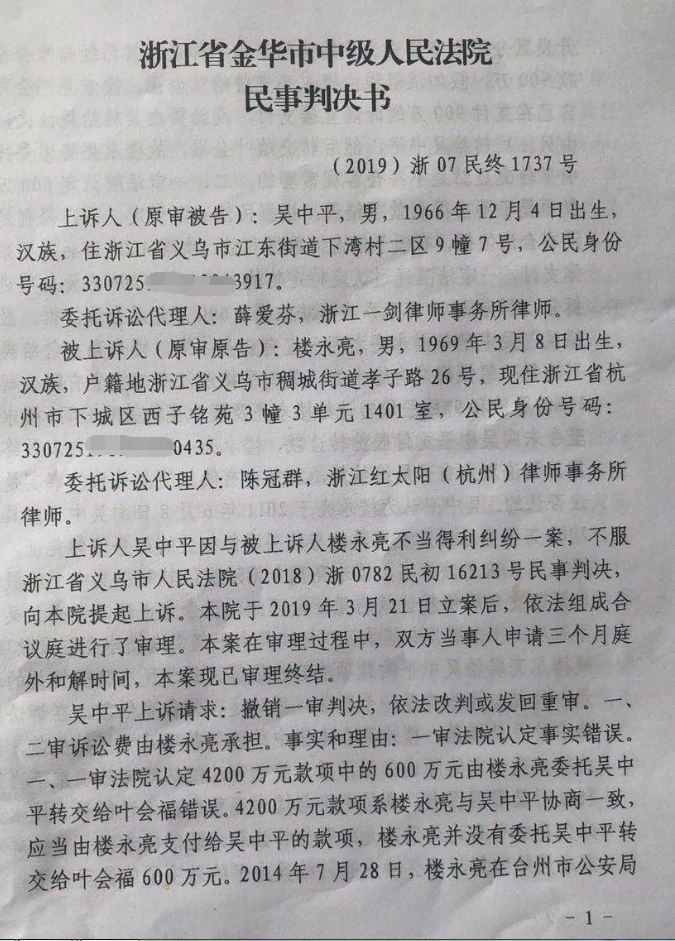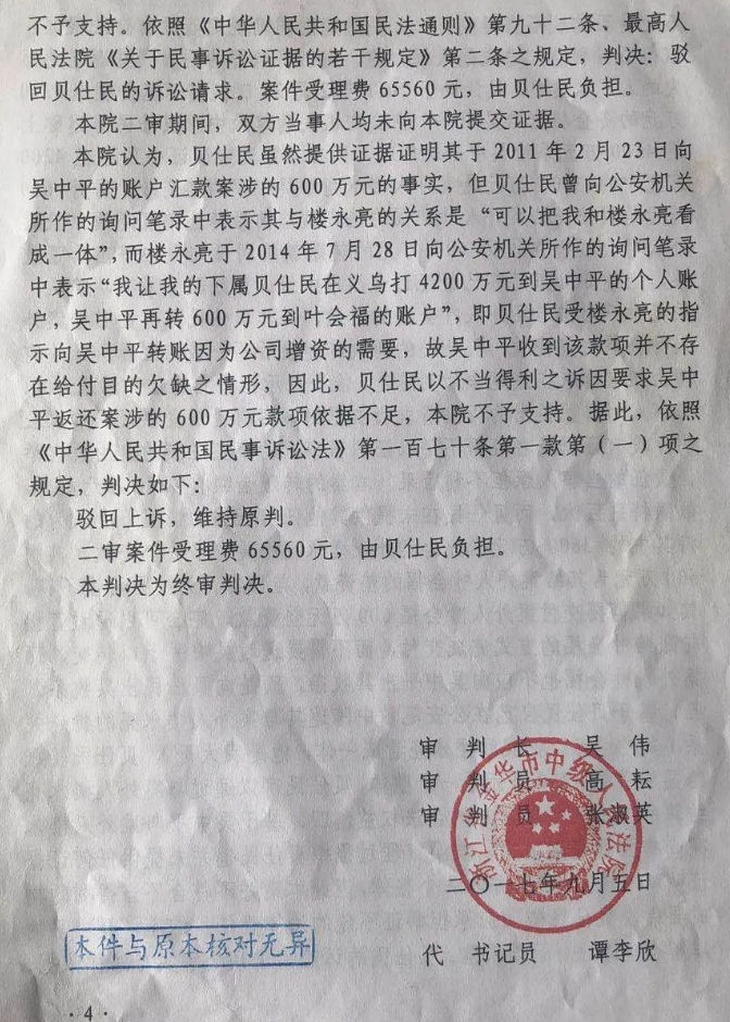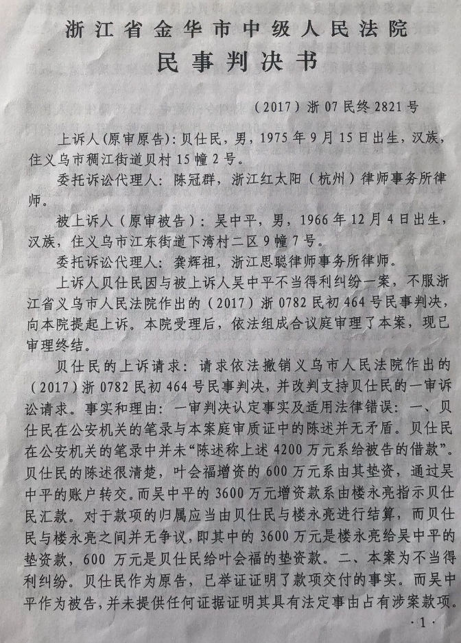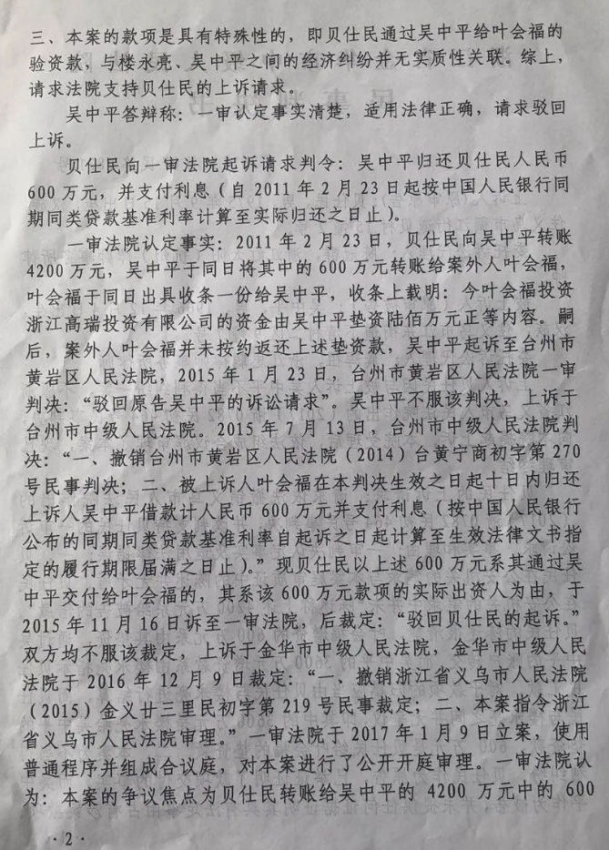在2017年义乌一审判决中,贝仕民和楼永亮认定为“一体”,“故本院认为原告贝仕民转帐给被告吴中平的4200万元系一个整体。”两次的股份转让涉及资金1亿多元,且楼永亮向吴中平借款2000万元也出具借条,至今未还,而金华市中级人民法院(2019)浙07民终1737号的判决是要吴中平归还600万元,外加利息,因属“不当得利。”
