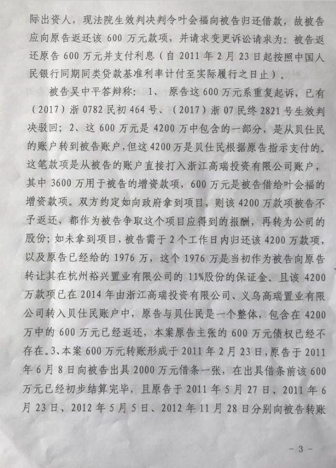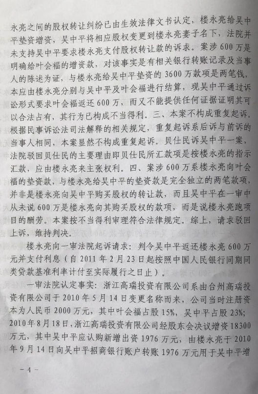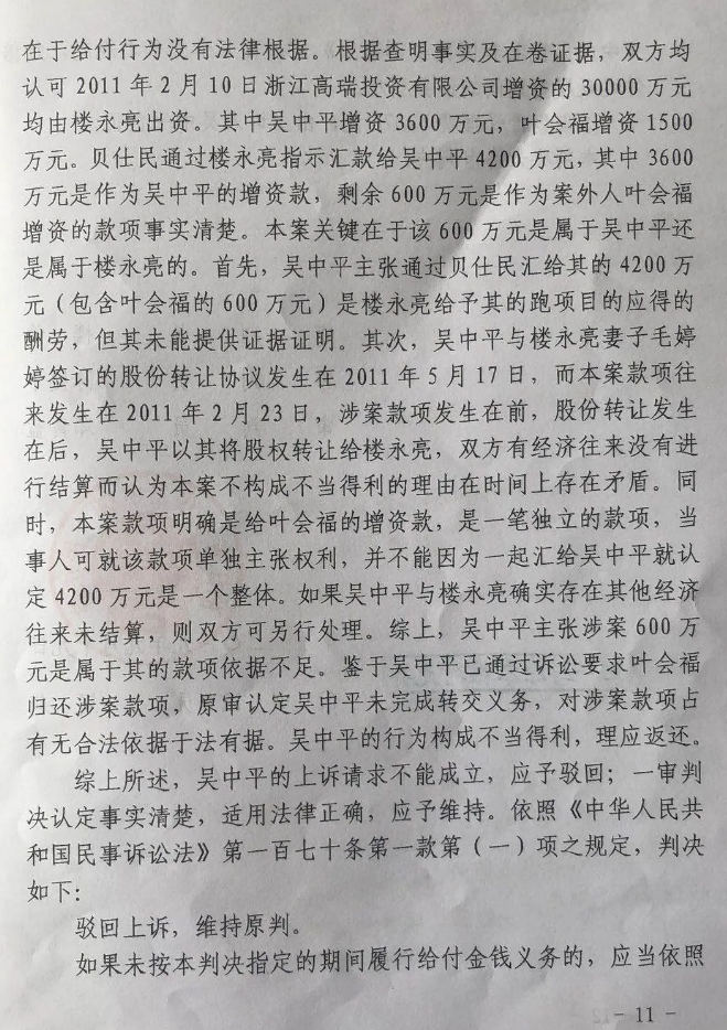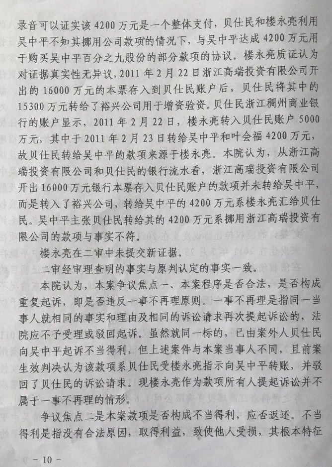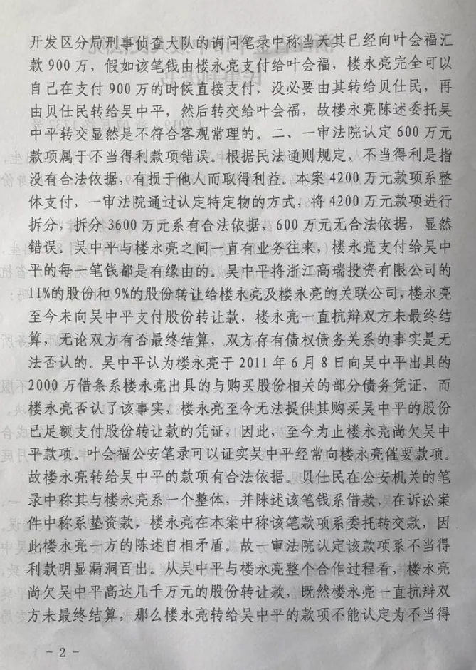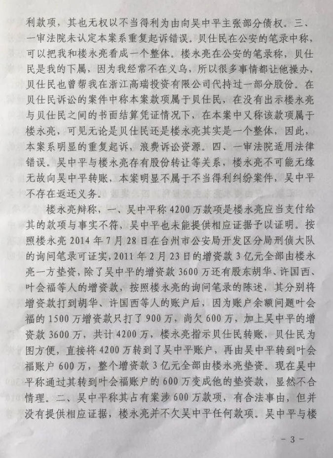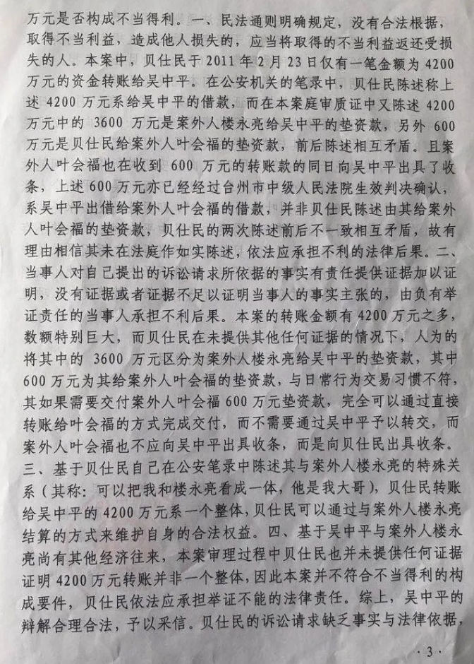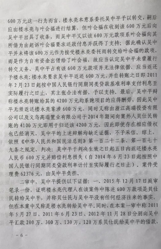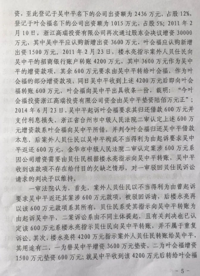 在2017年义乌一审判决中,贝仕民和楼永亮认定为“一体”,“故本院认为原告贝仕民转帐给被告吴中平的4200万元系一个整体。”两次的股份转让涉及资金1亿多元,且楼永亮向吴中平借款2000万元也出具借条,至今未还,而金华市中级人民法院(2019)浙07民终1737号的判决是要吴中平归还600万元,外加利息,因属“不当得利。”
