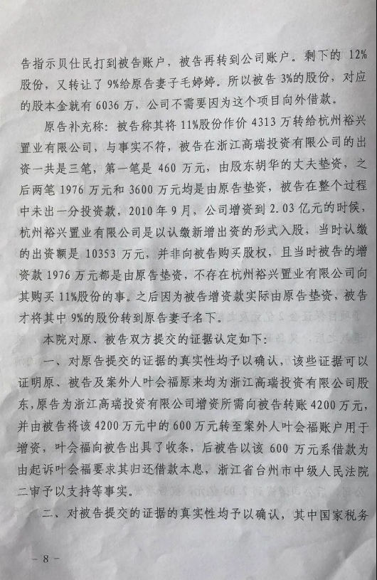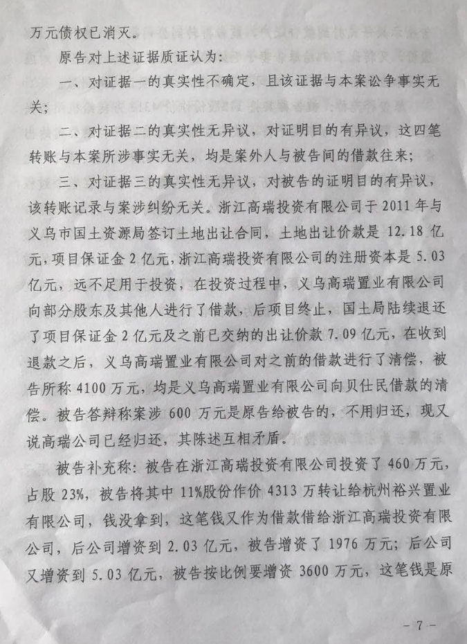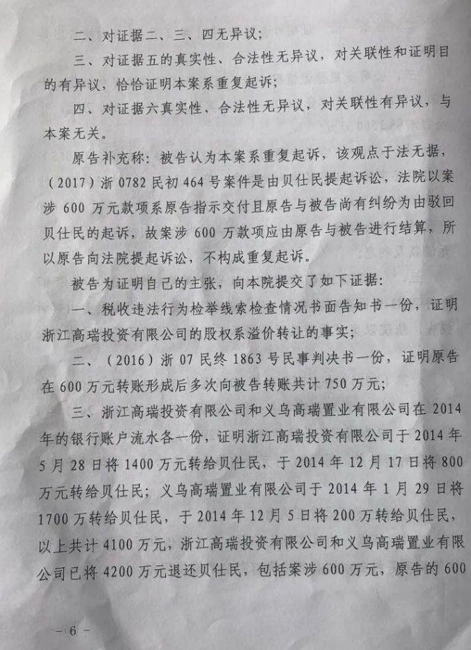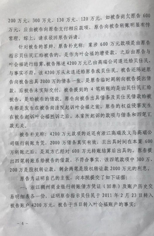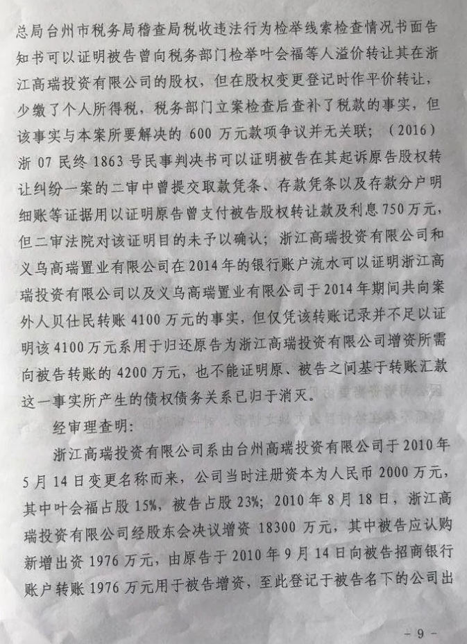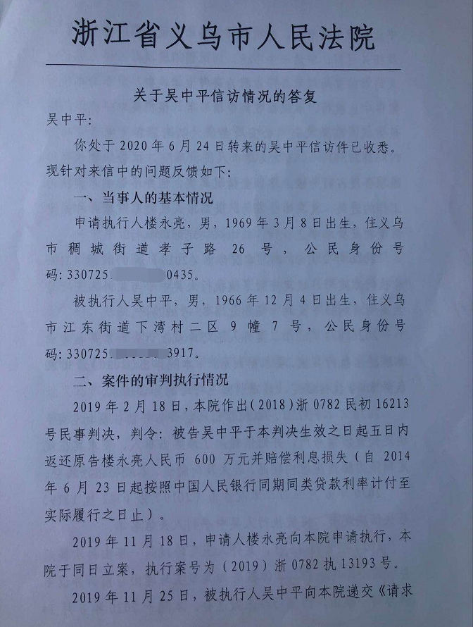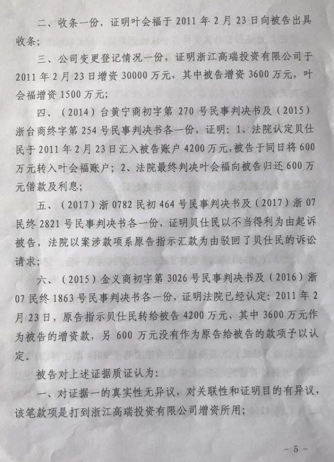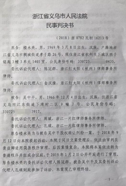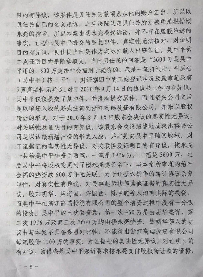 在2017年义乌一审判决中,贝仕民和楼永亮认定为“一体”,“故本院认为原告贝仕民转帐给被告吴中平的4200万元系一个整体。”两次的股份转让涉及资金1亿多元,且楼永亮向吴中平借款2000万元也出具借条,至今未还,而金华市中级人民法院(2019)浙07民终1737号的判决是要吴中平归还600万元,外加利息,因属“不当得利。”