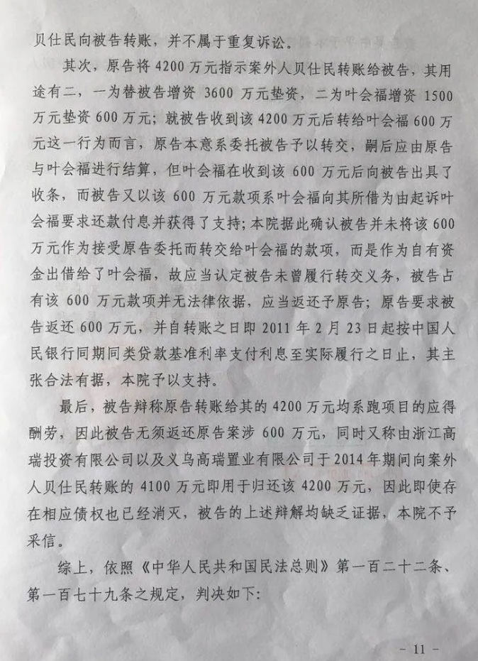 2、“本院据此确认被告并未将该600万之作为接受原告委托而转交给叶会福的款项,而是作为自有资金出借给了叶会福,故应当认定被告未曾履行转交义务,被告占有该600万元款项并无法律依据,应当返还予原告。”——浙江省义乌市人民法院(2018)浙0782民初16213号 审判长龚益卿