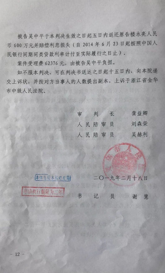 “吴中平的上诉请求不能成立,应予驳回。”——浙江省金华市中级人民法院(2019)浙07民终1737号 审判长楼俊,审判员陈旻尔