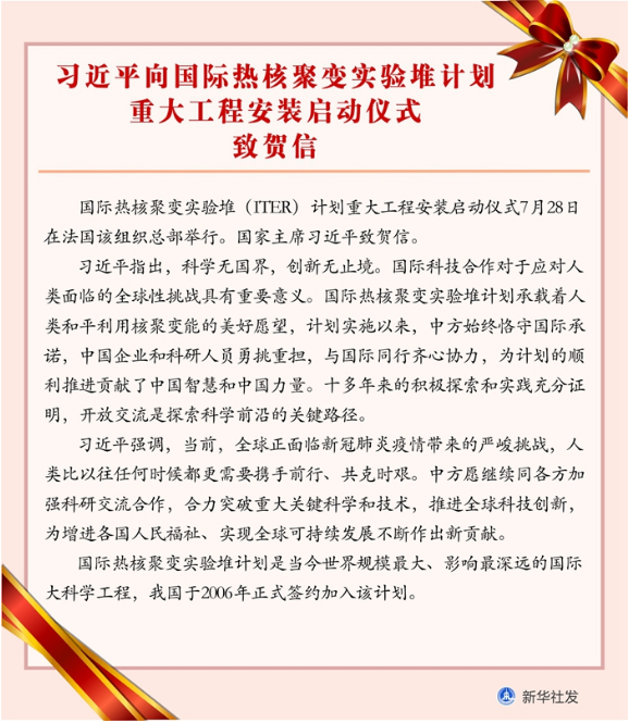 新华社北京7月28日电 国际热核聚变实验堆(ITER)计划重大工程安装启动仪式7月28日在法国该组织总部举行。国家主席习近平致贺信。