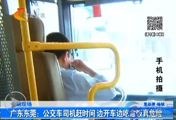 前日中午,112路公交车一名司机,因为赶时间,边吃饭边开车,一手握方向盘,一手端饭盒,往嘴里送饭时,甚至两只手都脱离了方向盘。这危险一幕让坐在其身后的一名女乘客用手机拍摄了下来。据了解,当时公交车正行驶在车多的莞太路上。
