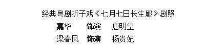 当天晚上演出的经典粤剧折子戏《七月七日长生殿》中唐明皇的扮演者嘉华,著名粤剧文武生;杨贵妃扮演者梁春凤,扮相靓丽,唱腔细腻。