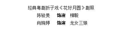 经典粤剧折子戏《花好月圆》中柳毅扮演者陈骏旻,国家二级演员,工文武小生行当;龙女三娘扮演者肖婉婷,国家二级演员,主攻小旦、兼饰娃娃生行当。