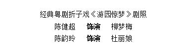 经典粤剧折子戏《游园惊梦》中柳梦梅扮演者陈健超,国家二级演员,广州粤剧团副团长,工文武小生行当;杜丽娘扮演者陈韵玲,国家二级演员,工花旦行当。