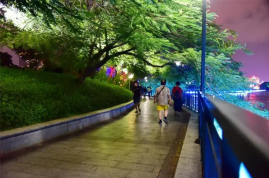 直接把一湖水变成海水,将湖边变成海边,这是西湖也做不到的,但是星湖做到了。星湖的夜是最美最静的。夜幕低垂,华灯初上,站在星湖牌坊广场远望,湖面水波荡漾,徜徉在凉凉微风里,一望无际。在灯光作用下,湖水变成蓝色,在这无边夜色里光影颤动如同海水,湖中的小山也秒变海岛。星湖是最多游客来跑步散步锻炼的地方,可谓赏景与锻炼两不误。