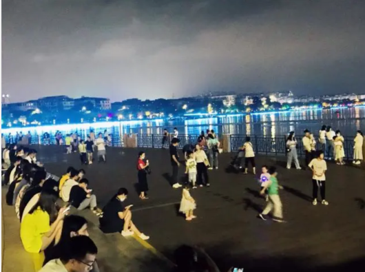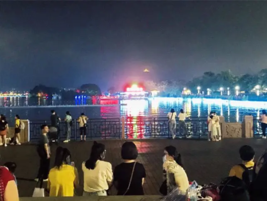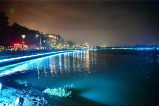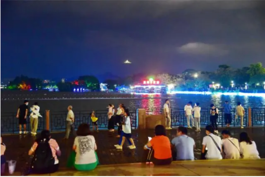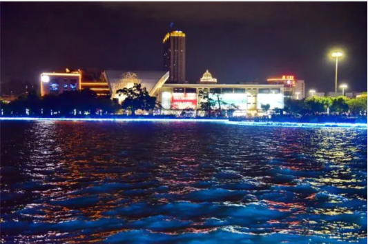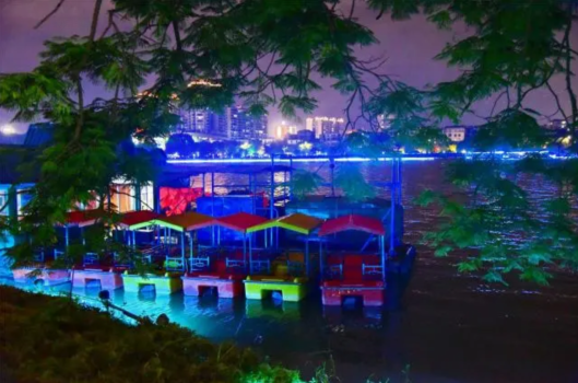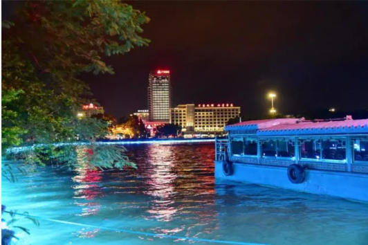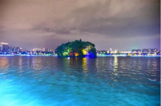 当然,可以乘舟夜游星湖,看天色如黛,秀水如镜,波光粼粼的美景,成群的夜鸟不时在湖面上飞翔。灯光映照下,水天一色,幻变出一片蓝调,让人的内心感到一种静谧、一种平静,一种城市的洁净。碰上有月亮的夜里,月光与灯光一同映入水中,织出一匹流光锦缎。