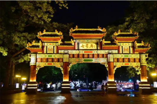 肇庆这座古城的夜生活一定是从七星岩牌坊广场开启的,因为七星岩牌坊是肇庆的地标,整个牌坊广场与繁华的城市和山清水秀的星湖连在一起,气势磅礴、唯美多姿的音乐喷泉和水幕电影,与庄重典雅的七星岩牌坊共同组成了肇庆最靓丽的风景。