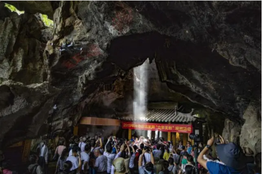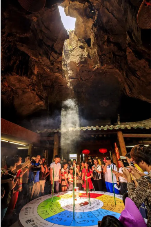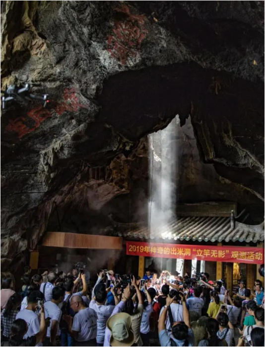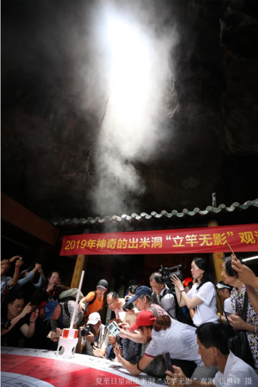 每年6月21日12时31分,肇庆星湖湿地公园出米洞内一缕阳光从洞顶的“天窗”射下来,穿透缭绕的香火,直射到井内的石龟上,只见立在石龟背上一标杆的日影逐渐变短消失,“立竿无影”的奇观让人啧啧称奇,每年都会吸引大量的游客前来观看。