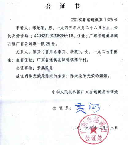 2018年12月,遂溪县公证处作出《公证书》(2018)粤湛遂溪第1326号证明:陈兴与陈光荣是姐弟关系。