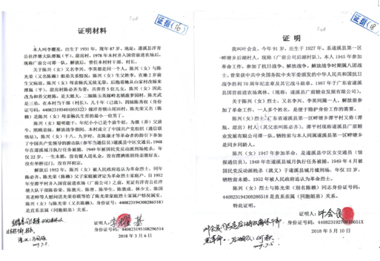 潭平村时任村干部、村长李耀基(现健在,89岁)证明陈兴(李兴,女)当时的身世及参加革命时的具体情况,并认定陈光荣的亲姐姐未婚。