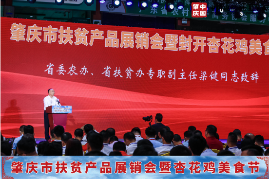 省委农办、省扶贫办专职副主任梁健在致辞时表示,肇庆市在此举办扶贫产品展销会暨杏花鸡美食节活动,既是肇庆市委、市政府贯彻落实总书记、党中央决策部署和省委、省政府关于消费扶贫工作安排的具体行动,也是全力打好脱贫攻坚收官战的务实之举。一直以来,肇庆市高度重视脱贫攻坚工作,坚持把打赢脱贫攻坚战作为重大政治任务和第一民生工程,咬定目标,精准施策,真帮实扶,工作扎实,成效明显,去年考核被评为“好”的等次,受到省委、省政府通报表扬。特别是今年疫情爆发以来,肇庆主动作为,迅速行动,应对疫情对脱贫攻坚影响和推动野生动物特色养殖项目转型转产工作得到省委分管领导的充分肯定,为全省提供了“肇庆方案”。扶贫专柜布点落地、消费扶贫爱心卡办理、肇庆馆运营等工作,行动快、措施实、效果好,也为全省深入推进消费扶贫提供了可复制、可借鉴的经验做法。希望肇庆市持续深入推进消费扶贫,全面宣传推介贫困地区特色农产品,促进贫困地区产品生产与市场有效对接,帮助贫困人口稳定脱贫和提升贫困地区持续发展能力。