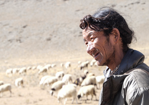 夕阳西下,边巴迎着喜马拉雅北麓入秋的疾风,一边打乌尔朵(藏语,牧人赶牛羊的投石工具),一边大声吆喝着赶羊群回圈。尽管长年风吹日晒在他脸上留下一道道“沟壑”,在海拔4400米的草场,心情欢快的边巴仍健步如飞。