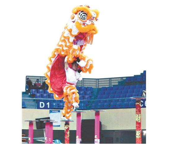 11月6日,2020年粤桂狮王争霸赛在广西壮族自治区钦州市举行,来自粤桂两地的12支队伍进行高桩南狮自选套路比赛。此次比赛最高的标桩有2.5米之高,共21根标桩。据狮人组织水乡联盟领队李伟杰介绍,比赛中,他们代表队的狮子在高高的桩台上连环推进飞跃如履平地,后退3步上桩腿,动作行云流水,一气呵成。“高桩舞狮是很难看清桩的,全靠队员默契配合,难度比较大。”李伟杰表示,比赛难在狮头狮尾两名队员需要同时跃起跳至两柱,非常考验狮头队员的平衡性和对狮子灵动神情的演绎,而狮尾队员为了配合狮头完成系列动作,在跳跃过程中要全神贯注,双手举起狮头队员并保持直立状态,同时将队员放到合适的高桩上,对力量和默契的要求更高。