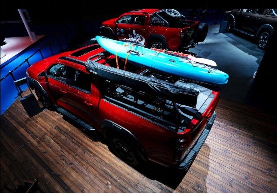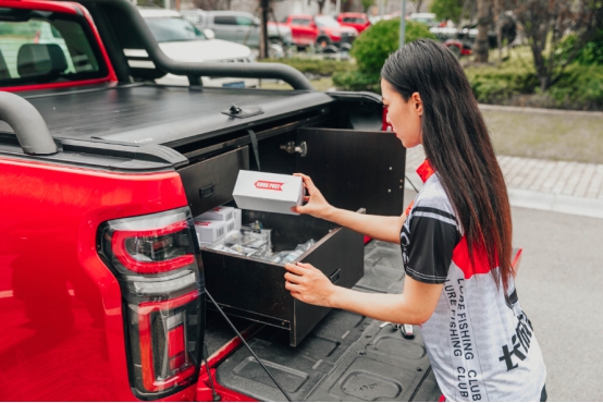 野钓版将货箱改装为滑轮抽屉式隔断储物仓,可将渔具和鱼获分类放置,告别鱼线缠绕和污水横流的窘境;全覆盖式龙门架,设置大量拓展固定点,分门别类放置鱼竿、铁锹等物品;此外,龙门架的框架一直延伸到车顶,像皮划艇等尺寸较大的户外装备可以通过固定组件安置在龙门架上方,想钓鱼或者想戏水都可以。